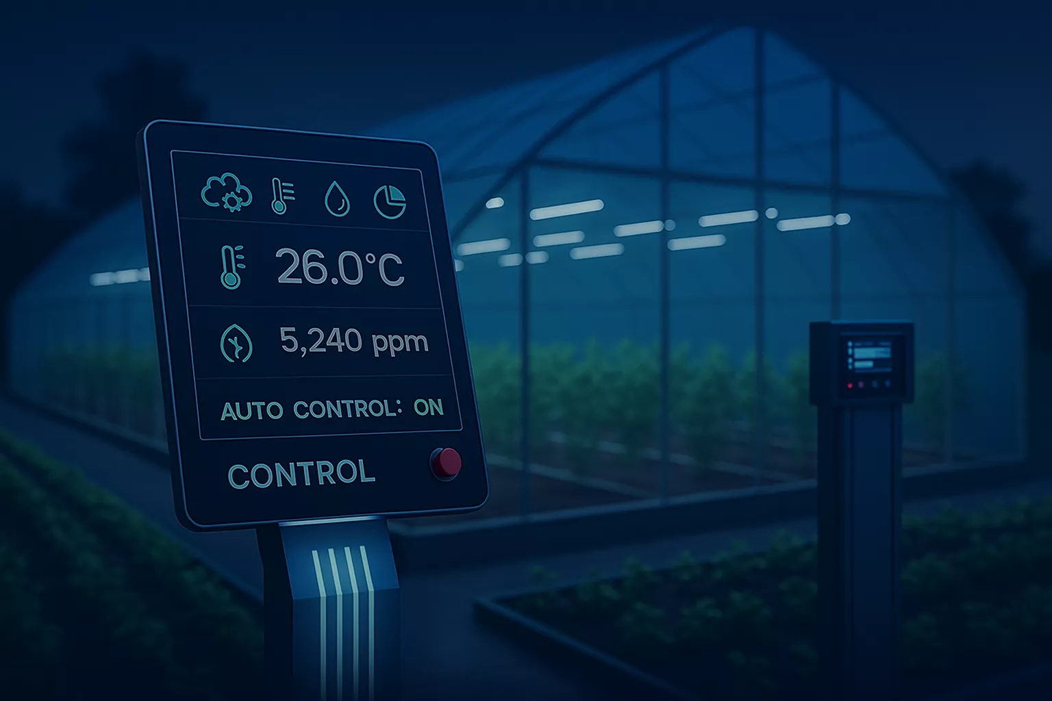 سیستم کنترل، لایهای بالاتر از مانیتورینگ است که بر اساس دادههای دریافتی از حسگرها و پارامترهای تعریفشده توسط کاربر، اقدامات خودکار یا دستی را اجرا میکند. به عنوان مثال اگر دما از حد مجاز بالاتر رود، سیستم بهطور خودکار فنها و سیستم سرمایشی را فعال میکند یا در صورت کاهش رطوبت خاک، سیستم آبیاری فعال میشود یا هنگام کمبود نور، سیستم روشنایی مصنوعی وارد مدار میشود و با توجه به نیاز کاربران میتوان سناریوهای مختلف را اجرا کرد. کنترل هوشمند باعث میشود عملیات کشاورزی با حداقل خطا و حداکثر بازدهی انجام شود.